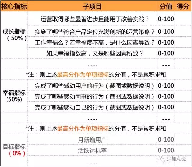 那么,按照李少加提出的“完全回歸人性”的管理理念,我們運(yùn)營KPI要做的就是將個(gè)體成長(zhǎng)指標(biāo)、個(gè)體幸福指標(biāo)盡量描述出來,示例如下: