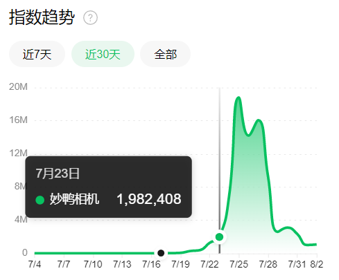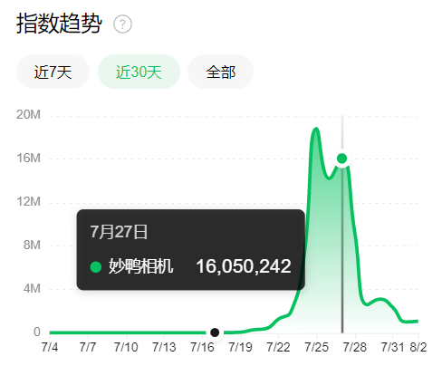 不過即使有這五點優(yōu)勢的加持,妙鴨相機(jī)在迅速走紅之后也出現(xiàn)了快速退熱。同樣從微信指數(shù)的來看,在經(jīng)歷7月25日、27日的兩個峰值后,妙鴨相機(jī)在微信平臺的熱度開始快速下滑。