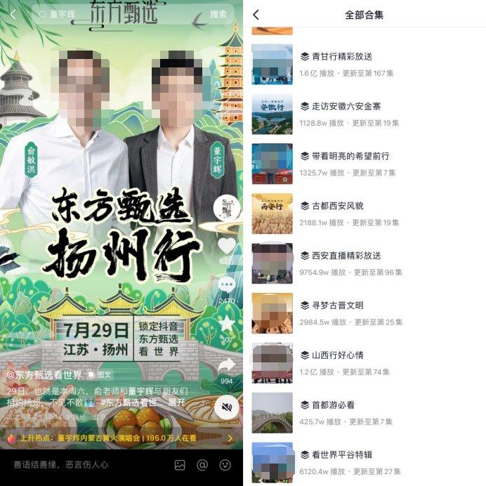 實際上,東方甄選布局文旅的動作要早很多。最為明顯的就是,去年11月,東方甄選孵化了子賬號“東方甄選看世界”。截至目前,“東方甄選看世界”賬號共擁有288萬粉絲,上傳了看世界湖南行、四川行、廣州行等10余外景直播合集,其中看世界西安行、云南行合集總播放量分為超9000萬和6000萬。