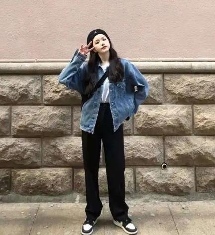 其實牛仔外套和白色直筒褲也挺配的,圖片上的可能不是正宗的直筒褲,但是在生活中你可以自己換成直筒褲,效果也是一樣的。