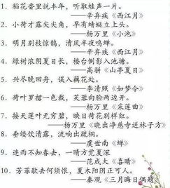 春:1,春眠不覺曉,處處聞啼鳥. 2,紅豆生南園,春來發(fā)幾枝. 3,好雨知時節(jié),當(dāng)春乃發(fā)生. 4,不知細(xì)葉誰裁出,二月春風(fēng)似剪刀. 夏: 1,力盡不知熱,但惜夏日長. 2,接天蓮葉無窮碧,映日荷花別樣紅. 秋: 1,秋風(fēng)蕭瑟,洪撥涌起. 2,八月秋高風(fēng)怒號,卷我屋上三重茅. 3,春花秋月何時了,往事知多少 冬: 1,梅須遜雪三分白,雪卻輸梅一段香. 2,青女素娥俱耐冷,月中霜里斗嬋娟. 風(fēng): 1, 相見時難別亦難,東風(fēng)無力百花殘 2,不知細(xì)葉誰裁出,二月春風(fēng)似剪刀. 3,云想衣裳花想容,春風(fēng)扶檻露華濃. 花: 1,感時花濺淚,恨別鳥驚心. 2,曲徑通幽處,禪房花木深. 3,無可奈何花落去,似曾相識雁歸來. 4,忽如一夜春風(fēng)來,千樹萬樹梨花開. 5,停車坐愛楓林晚,霜葉紅于二月花. 雪: 1,遙知不是雪,惟有暗香來 .2,窗含西嶺千秋雪,門泊東吳萬里船. 3,北風(fēng)卷地白草折,胡天八月即飛雪. 月: 1,大漠沙如雪,燕山月似鉤. 2,可憐九月初三夜,露似真珠月似弓. 3,尋常一樣窗前月,繞有梅花便不同. 山: 1,兩岸猿聲啼不住,輕舟已過萬重山. 2,兩岸青山相對出,孤帆一片日邊來. 水: 1,天門中斷楚江開,碧水東流至此回. 2,飛流直下三千尺,疑是銀河落九天. 3,日出江花紅勝火, 春來江水綠如藍(lán). 4,一道殘陽鋪水中,半江瑟瑟半江紅. 1 無志之人常立志,有志之人立長志 2 少壯不努力,老大徒傷悲 3 不識廬山真面目,只緣身在此山中 4 本是同根生,相煎何太急 5 獨(dú)在異鄉(xiāng)為異客,每逢佳節(jié)倍思親 6 粉身碎骨渾不怕,要留清白在人間 7 遙知不是雪,唯有暗香來 8 莫愁前路無知己,天下誰人不識君 9 野火燒不盡,春風(fēng)吹又生 10 勸君更盡一杯酒,西出陽關(guān)無故人 11 誰知盤中餐,粒粒皆辛苦 12 小河才露尖尖角,早有蜻蜓立上頭 13 飛流直下三千尺,疑是銀河落九天 14 欲窮千里目,更上一層樓 15 爆竹聲中一歲除,春風(fēng)送暖入屠蘇 16 白兔搗藥成,問言與誰餐 17 誰言寸草心,報得三春暉 18 舉頭望明月。