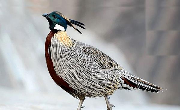 體長(zhǎng)39-63cm,重750-1100g。雄鳥(niǎo)頭頂棕褐,冠羽細(xì)長(zhǎng),同色而較棕。頸側(cè)在耳羽后面下方有一大形的白色塊斑,下眼瞼具一小白斑。頭的余部包括頦、喉等均為黑色。上體羽毛呈披針形,概紫灰色。尾上覆羽及中央尾羽,其中部為褐灰色。外側(cè)尾羽灰色,具三道黑色橫斑,近端黑斑較寬。肩羽大都棕褐色,貫以白色或皮黃色羽干紋。尾下覆羽暗栗,具黑色次端斑和白色端斑。虹膜褐色,嘴黑,腳暗紅色。