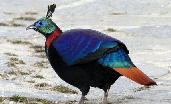 尼泊爾國鳥,又名九色鳥,非常美麗,尤其是雄鳥色彩極為絢麗,頭頂有一簇特別延長的藍綠色羽冠,其羽干細而裸出,羽端呈匙狀,向前卷曲,如同絲絨一般,甚為奇特,是虹雉中羽冠最漂亮的。